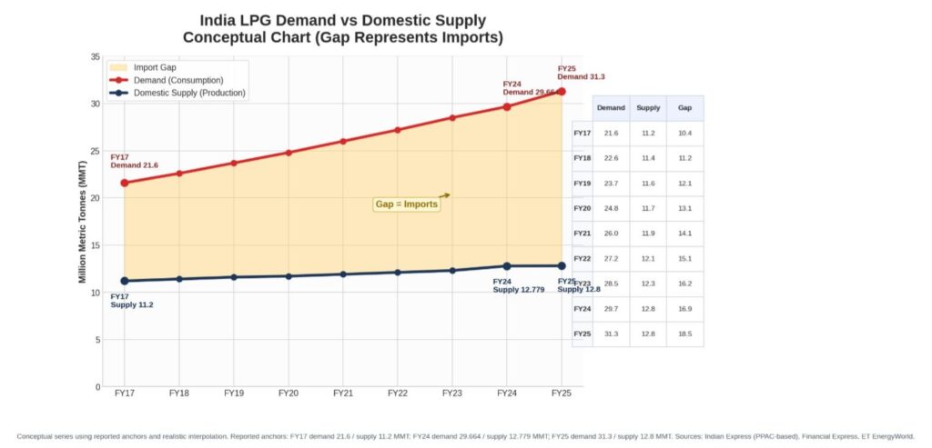 The LPG ecosystem in India is structurally constrained. Domestic production is limited because LPG is not a primary product—it is a by-product of crude oil refining and natural gas processing. This creates a ceiling on how much LPG can ever be produced locally.